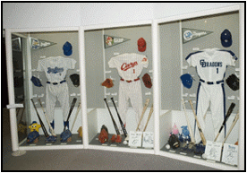 the team member uniforms in a showcase along with photographs, and other